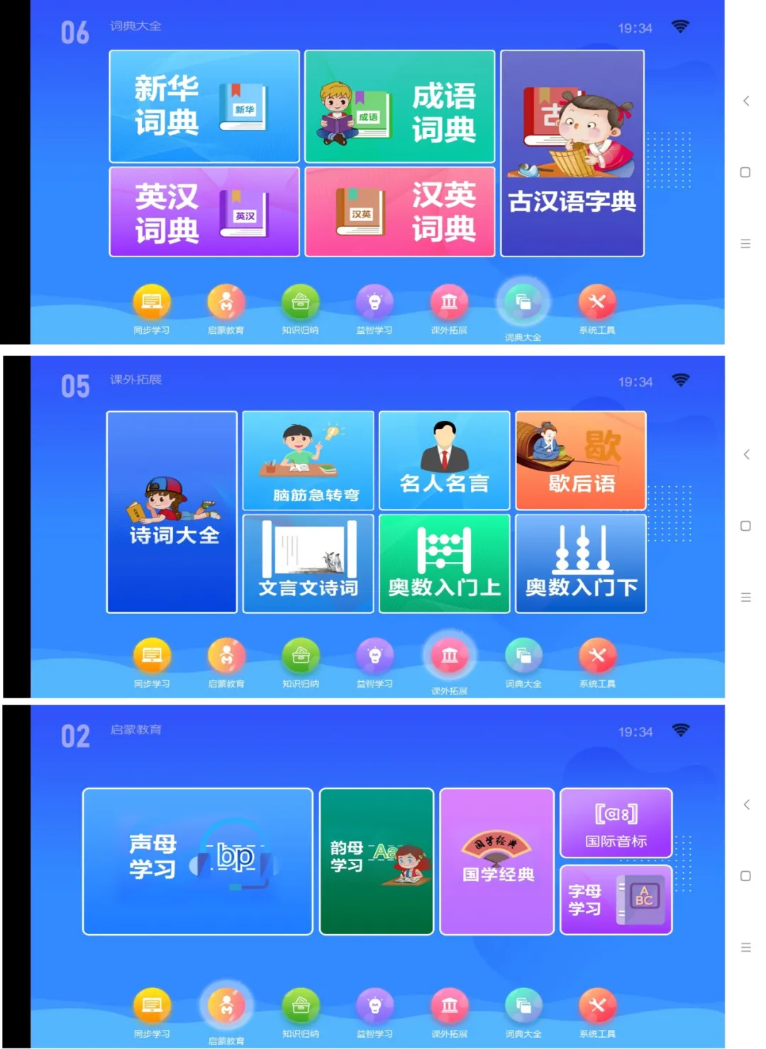 菜单栏底部还有很多小工具,都是非常实用的,如启蒙教育可以学习英标和拼音;可谓拓展有趣味的脑筋急转弯和名人名言等等,海量的词典:新华、成语、英汉、古汉语词典…