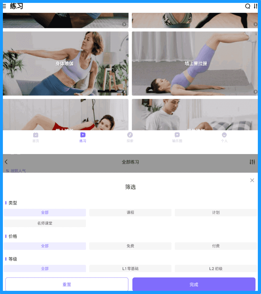 随着学习的深入,还有进阶课程,如流瑜伽、哈他瑜伽、阿斯汤加瑜伽等多种风格可供选择,满足不同用户的喜好和需求。